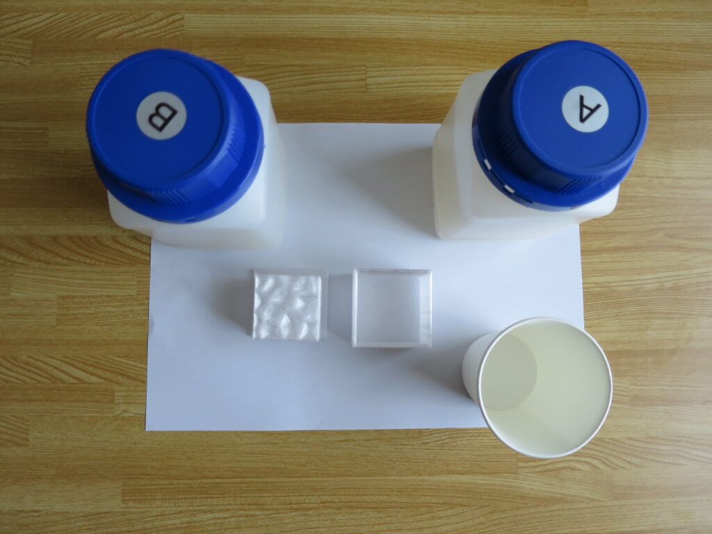 このAとBは通常は片栗粉を多めに溶かした水のようにとろとろした液体なのですが、混ぜ合わせて一定時間放置すると固まり、私たちがよく目にするようなシリコンになります。