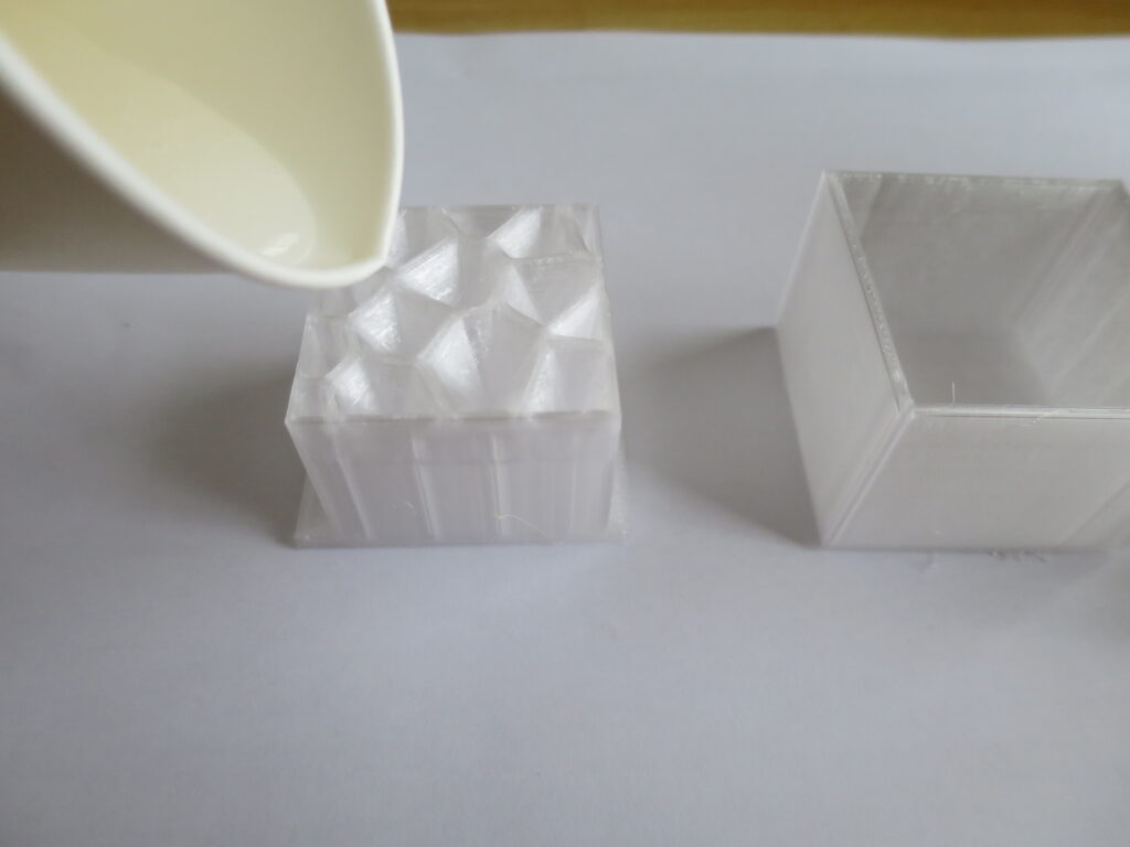 次は、混ぜ合わせたシリコン原液を3dプリント部品に流し込んでいきます。