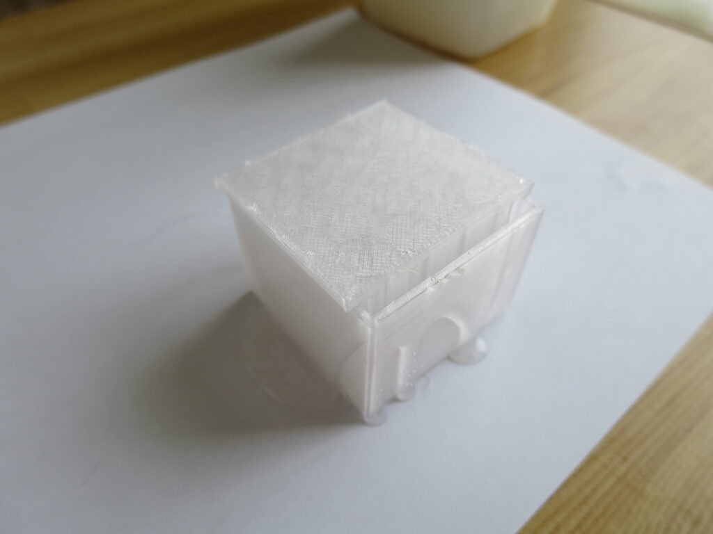 この時、シリコン原液には気泡が入っているため、3dプリント部品全体を軽くテーブルに落下させるなどして振動を与え、気泡を減らす工夫をすると良いです。