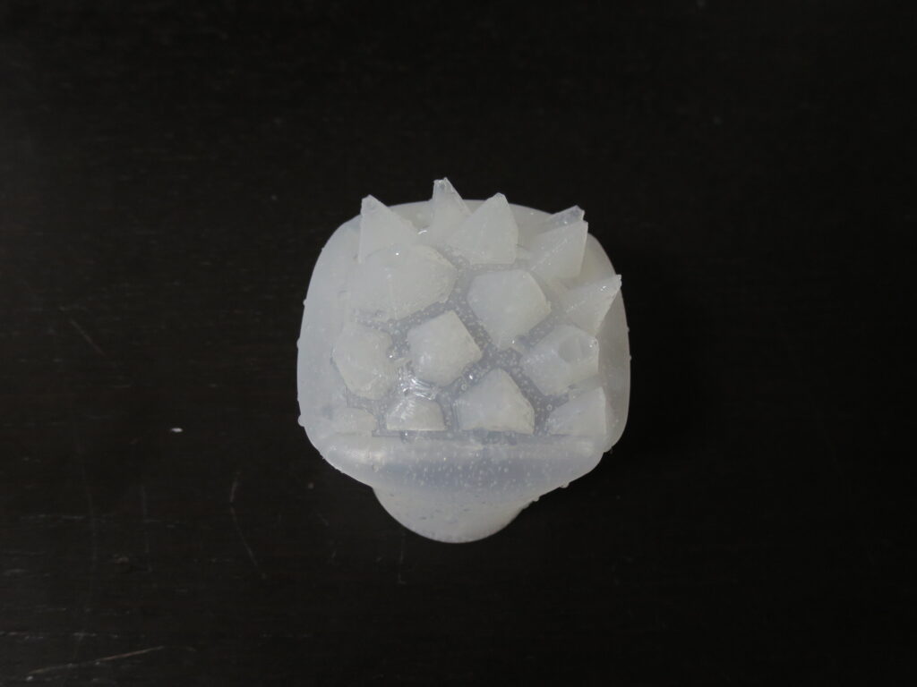 今回はとんがり部分に空気が入る可能性があったため、先にとんがり部分にシリコンを流し込んでから3dプリント部品全体に流し込みました。