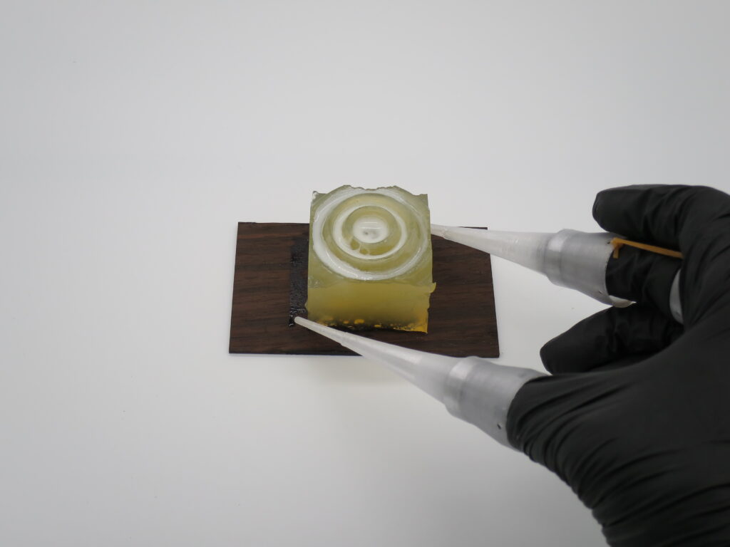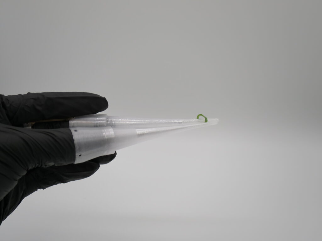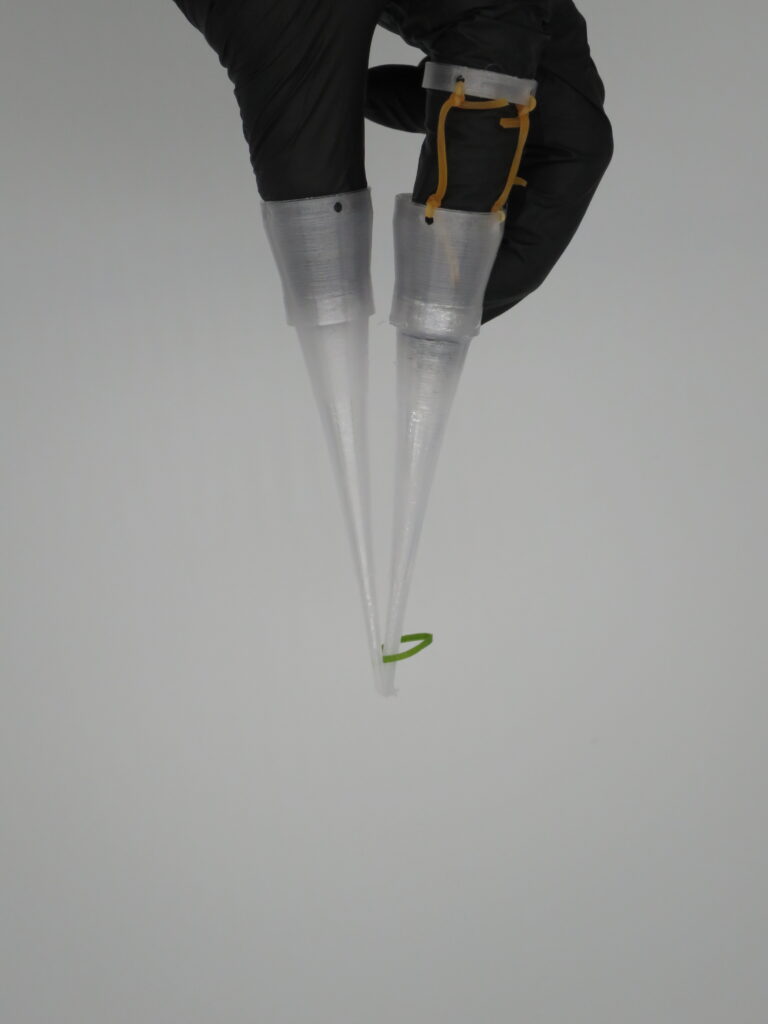この仮説をもとに作ってみたのが、画像のツールです。指をのばしたら使いやすいのではないかという発想をそのまま形にしてみました。ツールの長さは約10cmほど。構造はシンプルで、中は空洞になっており、カパッと指にはめられるようになっています。