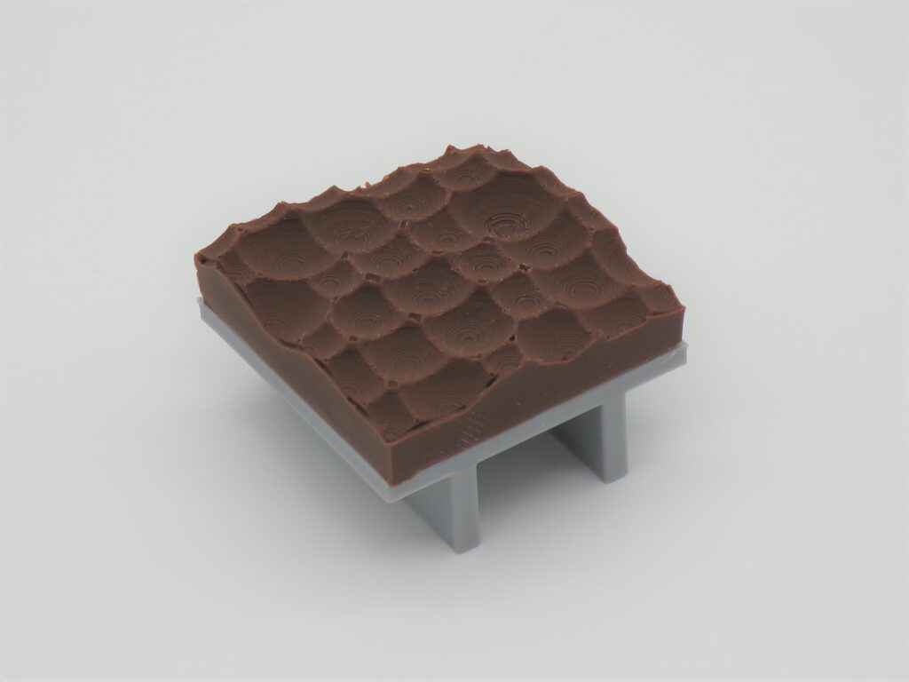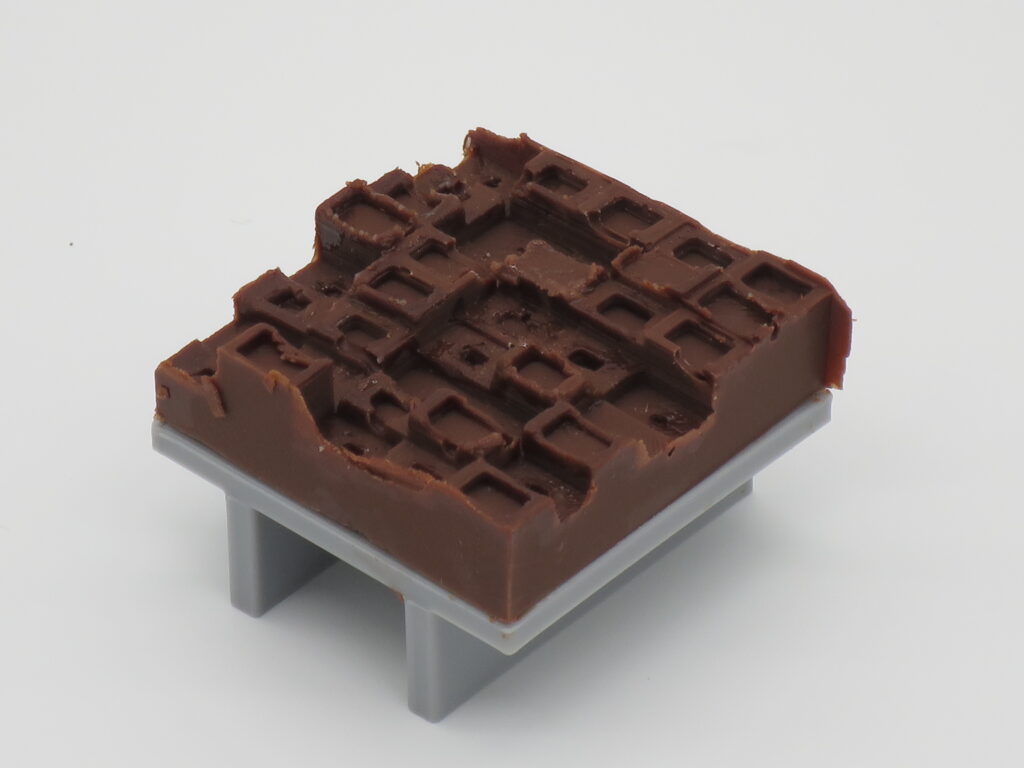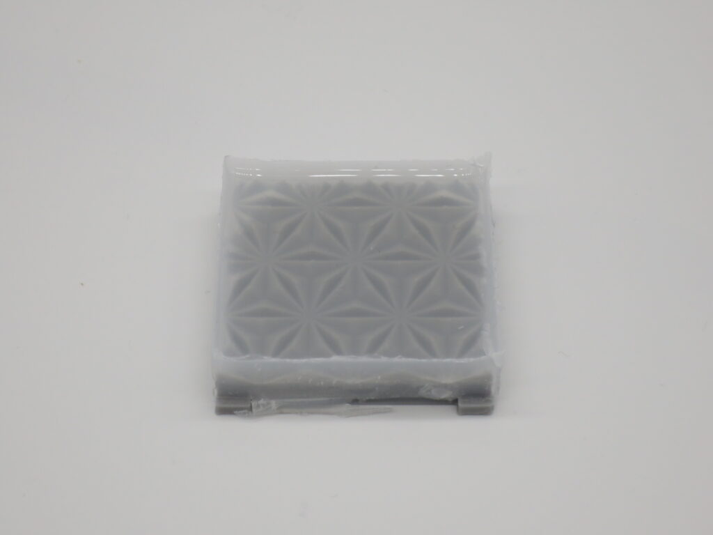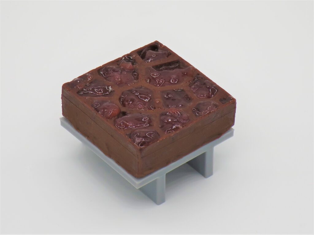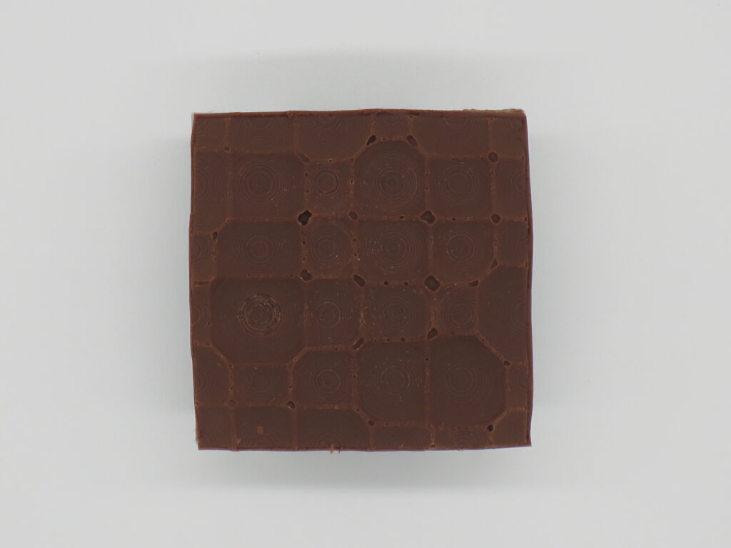 複数の四角い凹凸デザインも作ってみました。こちらは、カドが上手くできておらず、かけたり、丸まったりしてしまっています。これには、実際に作った時の様子から3つの原因が考えられます。①チョコレートが固まり切っていなかったこと、②チョコレートが薄すぎたこと、③気泡が入ってしまったこと、です。