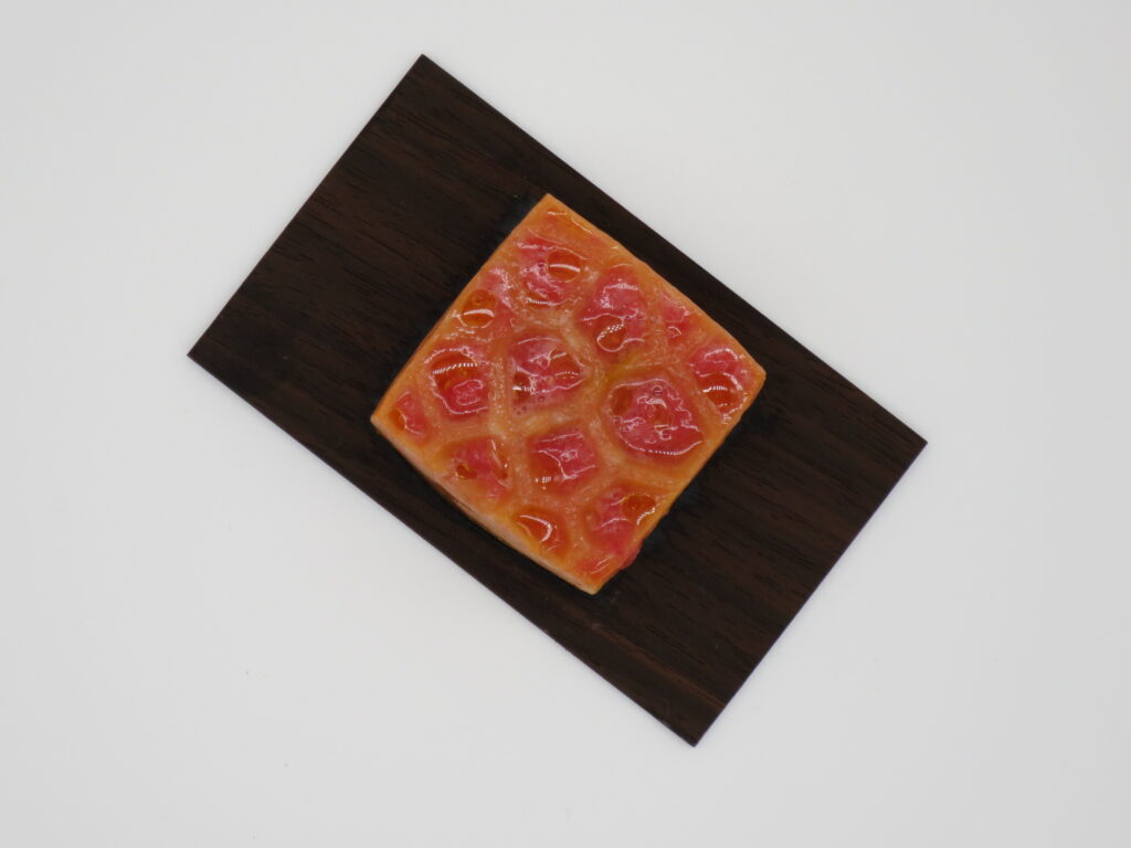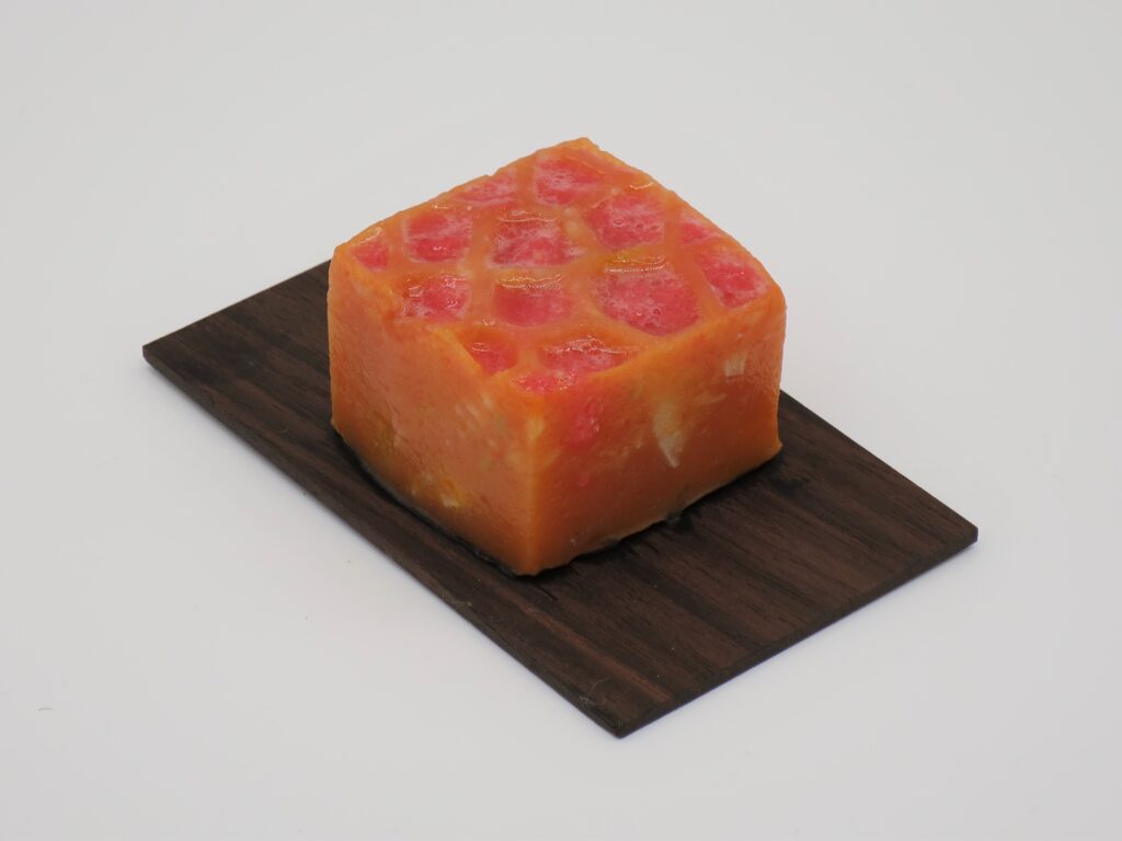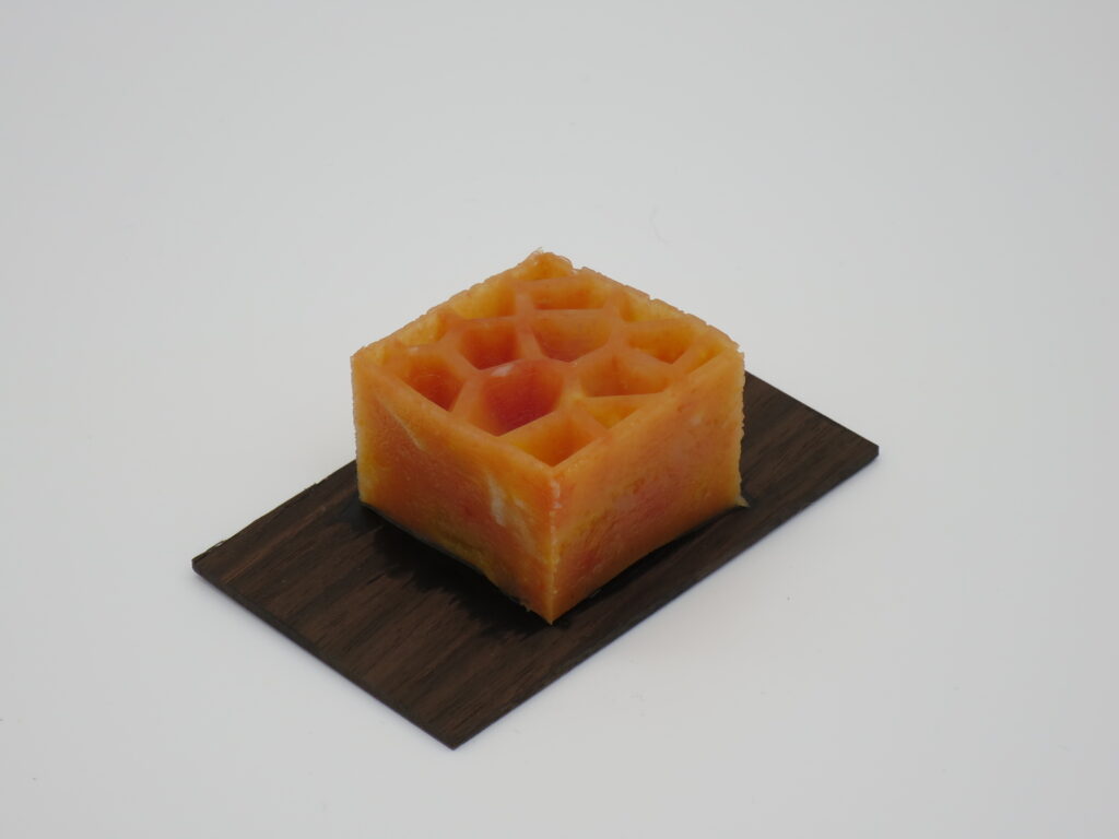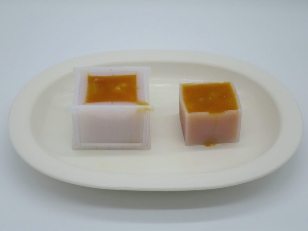 型枠から外したものがこちらになります。しっかりと形が反映できてます。これで、ベースは完成です。これに、今回はトマトをミキサーで細かくしたものを流し込みます。